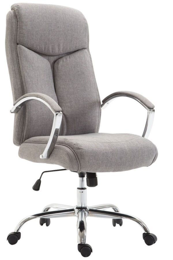 Bürostuhl XL Vaud Stoff Der XL Bürostuhl Vaud ist ideal für große und schwere Personen geeignet, da die Gasdruckfeder auf einen dauerhaften Gebrauch bis zu 140 kg ausgerichtet ist. Es handelt es sich um einen Bürostuhl mit hochwertiger Polsterung und Stoffbezug. Die Sitzhöhe ist mit dem Hebel unter dem Sitz stufenlos verstellbar, dadurch ist ergonomisches Sitzen garantiert. Der eingebaute Wippmechanismus sorgt zudem für mehr Bewegungsfreiheit. Das Gestell des Bürostuhls besteht aus Metall in Chromoptik. Standsicher steht er auf fünf robusten Kunststofflaufrollen. Egal ob Hart- oder Teppichböden – Sie werden immer leicht und locker über den Boden rollen können. Materialzusammensetzung: 100% Polyester Ca. Maße: Gesamthöhe: 115 – 125 cm Gesamtbreite: 65 cm Gesamttiefe: 73 cm Sitzhöhe: 48 – 58 cm Sitzfläche (BxT): 54 x 52 cm Höhe Armlehne: 70 – 80 cm Höhe Rückenlehne: 68 cm Belastbarkeit:…