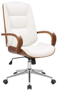 Bürostuhl Yankton Der Chefsessel Yankton ist ein stilvoller Bürostuhl mit einer sehr hochwertigen Polsterung mit Kunstlederbezug. Kunstlederbezüge haben den Vorteil, dass sie elastisch sind und sich bei Entlastung wieder glatt ziehen. Dies sieht nicht nur schöner aus, sondern erhöht zusätzlich die Lebensdauer des Sitzbezuges. Der Holzrahmen aus Bugholz macht diesen Bürostuhl zum absoluten Hingucker und verleiht ihm ein edles Design. Dank der stufenlos verstellbaren Sitzhöhe ist ergonomisches Sitzen garantiert und der eingebaute Wippmechanismus sorgt für mehr Bewegungsfreiheit. Das Gestell ist aus Metall in Chromoptik und sehr stabil. Der Bürostuhl steht standsicher auf fünf Leichtlaufrollen. Egal ob Hart- oder Teppichböden – Sie werden immer leicht und locker über den Boden rollen können. Materialzusammensetzung: 100% Polyurethan Ca. Maße: Gesamthöhe: 102 – 110 cm Gesamtbreite: 60 cm …