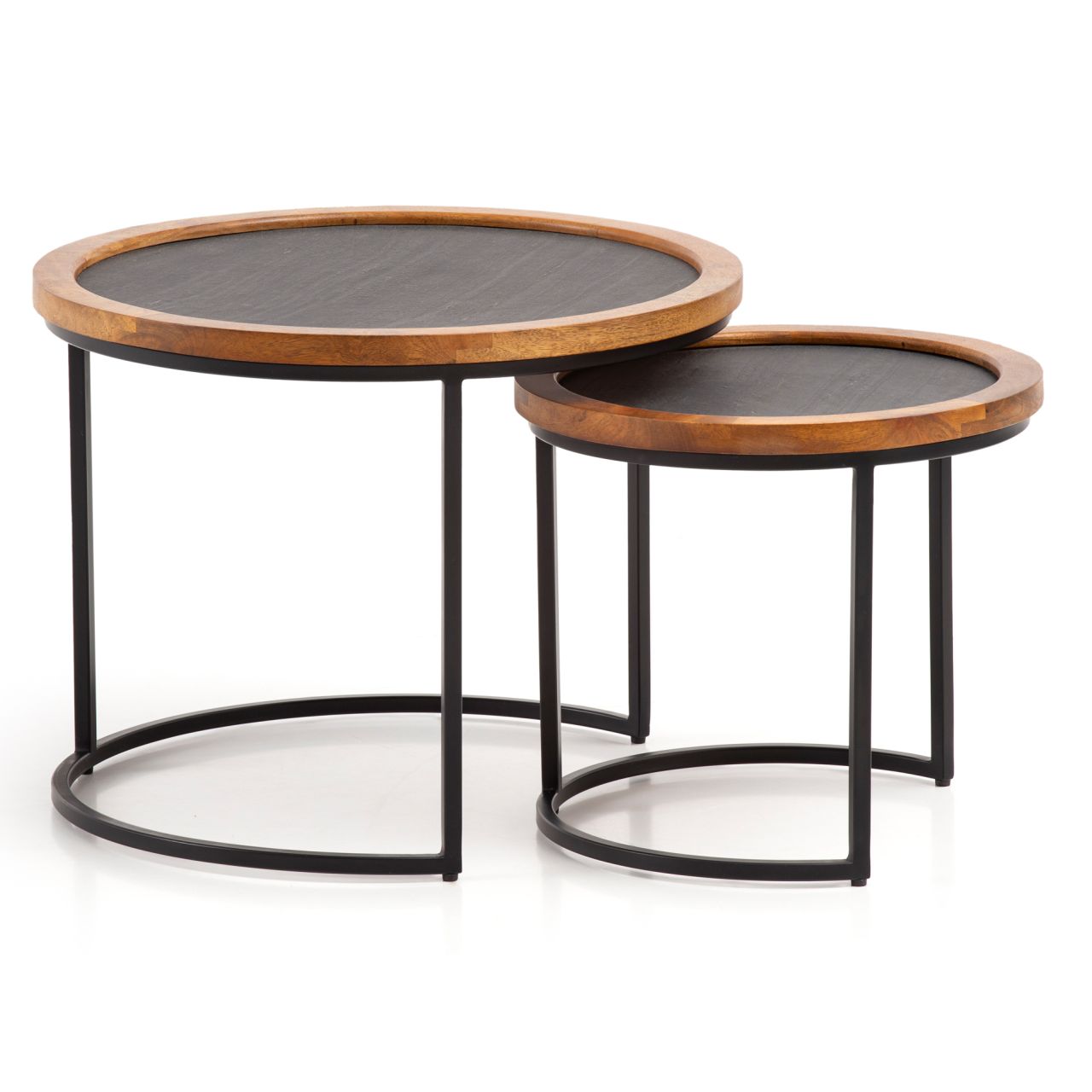 Couchtisch 2er Set Mango Massivholz / Steinoptik Wohnzimmertisch Rund, Satztisch mit Metallgestell, Kaffeetisch Modern, Sofatisch Verschachtelungstisch 2-teilig Braun / Anthrazit