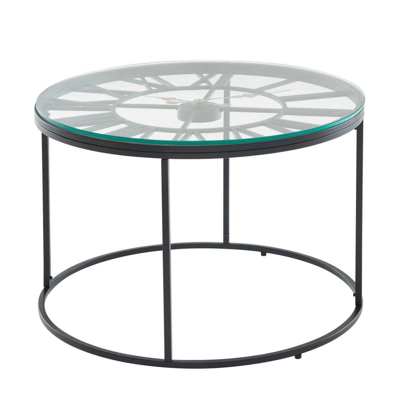 Design Runder Couchtisch in modernem Design Dekorative Uhr mit römischem Zifferblatt Durchsichtige Tischplatte Robustes Metallgestell Abmessungen Breite: 60 cm Tiefe: 60 cm Höhe: 43 cm Ti...