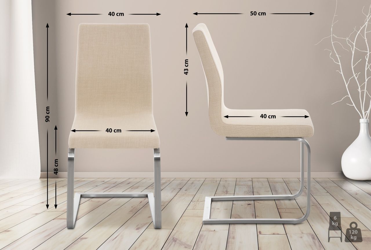 Esszimmerstuhl Belfort Stoff Der Esszimmerstuhl Belfort STOFF zeichnet sich durch modernes Design und hohe Funktionalität aus. Der Stuhl im Freischwinger-Stil passt sich nahtlos in verschiedene Einrichtungsstile ein und ist für den Einsatz im Esszimmer, in der Küche oder im Wohnzimmer geeignet. Das Gestell besteht aus robustem, matt gebürstetem Edelstahl, das für eine lange Haltbarkeit und Stabilität sorgt. Die Sitzfläche und die Rückenlehne sind mit einem langlebigen Stoff bezogen und verfügen über eine dicke Polsterung, die für hohen Sitzkomfort sorgt. Die ergonomisch geformte Rückenlehne unterstützt die natürliche Körperhaltung und reduziert den Druck auf die Taille, was besonders bei längerem Sitzen von Vorteil ist. Der Stoffbezug ist pflegeleicht und kann einfach mit einem feuchten Tuch gereinigt werden. Die an den Stuhlbeinen angebrachten Kunststoff-Füße schützen den Boden vor K…