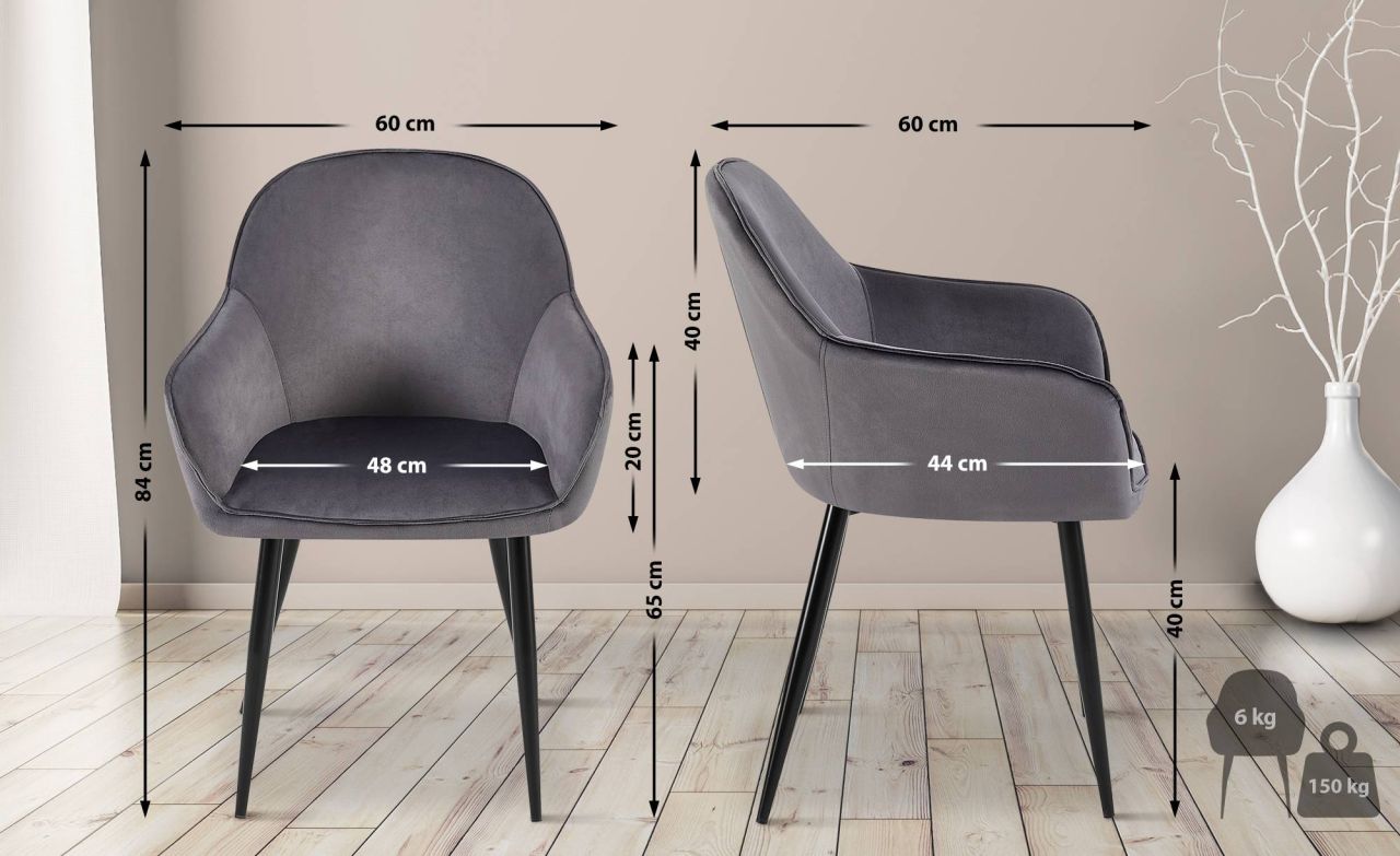 Esszimmerstuhl Boise Samt-Bezug Der Esszimmerstuhl Boise ist eine bequeme und zugleich stilvolle Sitzgelegenheit für Küche, Esszimmer und Wohnbereich. Der Stuhl verfügt über eine großzügig gepolsterte Sitzfläche und ermöglicht somit ein komfortables Sitzen auch über einen längeren Zeitraum hinaus. Ergänzt wird der Sitzkomfort durch die Rückenlehne und die Armlehnen. Das Vierfußgestell aus Metall, verspricht Stabilität und sicheren Stand. Mit bis zu 150 Kilogramm kann der Polsterstuhl bedenkenlos belastet werden. Die Bodenschoner unter den Stuhlbeinen beugen Beschädigungen empfindlicher Böden vor. Materialzusammensetzung: 100% Polyester Details: Gesamthöhe: 84 cm Gesamtbreite: 60 cm Gesamttiefe: 60 cm Sitzhöhe: 40 cm Sitzfläche (B x T): 48 x 44 cm Höhe Rückenlehne: 40 cm Höhe Armlehne (ab Boden): 65 cm Max. Belastbarkeit: 150 kg Gewicht: 6 kg