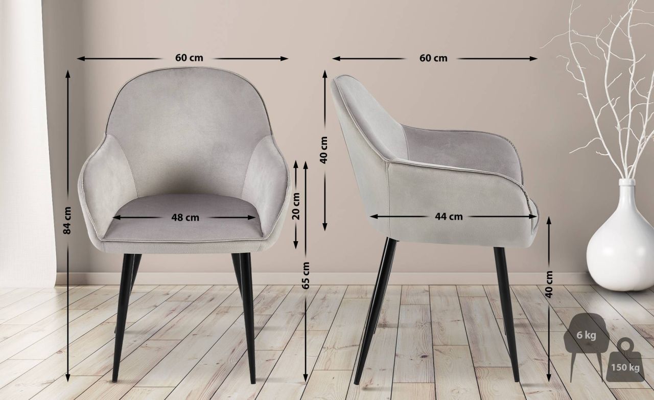Esszimmerstuhl Boise Samt-Bezug Der Esszimmerstuhl Boise ist eine bequeme und zugleich stilvolle Sitzgelegenheit für Küche, Esszimmer und Wohnbereich. Der Stuhl verfügt über eine großzügig gepolsterte Sitzfläche und ermöglicht somit ein komfortables Sitzen auch über einen längeren Zeitraum hinaus. Ergänzt wird der Sitzkomfort durch die Rückenlehne und die Armlehnen. Das Vierfußgestell aus Metall, verspricht Stabilität und sicheren Stand. Mit bis zu 150 Kilogramm kann der Polsterstuhl bedenkenlos belastet werden. Die Bodenschoner unter den Stuhlbeinen beugen Beschädigungen empfindlicher Böden vor. Materialzusammensetzung: 100% Polyester Details: Gesamthöhe: 84 cm Gesamtbreite: 60 cm Gesamttiefe: 60 cm Sitzhöhe: 40 cm Sitzfläche (B x T): 48 x 44 cm Höhe Rückenlehne: 40 cm Höhe Armlehne (ab Boden): 65 cm Max. Belastbarkeit: 150 kg Gewicht: 6 kg