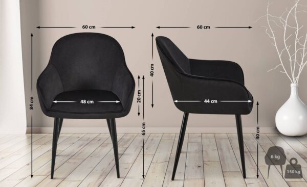 Esszimmerstuhl Boise Samt-Bezug Der Esszimmerstuhl Boise ist eine bequeme und zugleich stilvolle Sitzgelegenheit für Küche, Esszimmer und Wohnbereich. Der Stuhl verfügt über eine großzügig gepolsterte Sitzfläche und ermöglicht somit ein komfortables Sitzen auch über einen längeren Zeitraum hinaus. Ergänzt wird der Sitzkomfort durch die Rückenlehne und die Armlehnen. Das Vierfußgestell aus Metall, verspricht Stabilität und sicheren Stand. Mit bis zu 150 Kilogramm kann der Polsterstuhl bedenkenlos belastet werden. Die Bodenschoner unter den Stuhlbeinen beugen Beschädigungen empfindlicher Böden vor. Materialzusammensetzung: 100% Polyester Details: Gesamthöhe: 84 cm Gesamtbreite: 60 cm Gesamttiefe: 60 cm Sitzhöhe: 40 cm Sitzfläche (B x T): 48 x 44 cm Höhe Rückenlehne: 40 cm Höhe Armlehne (ab Boden): 65 cm Max. Belastbarkeit: 150 kg Gewicht: 6 kg