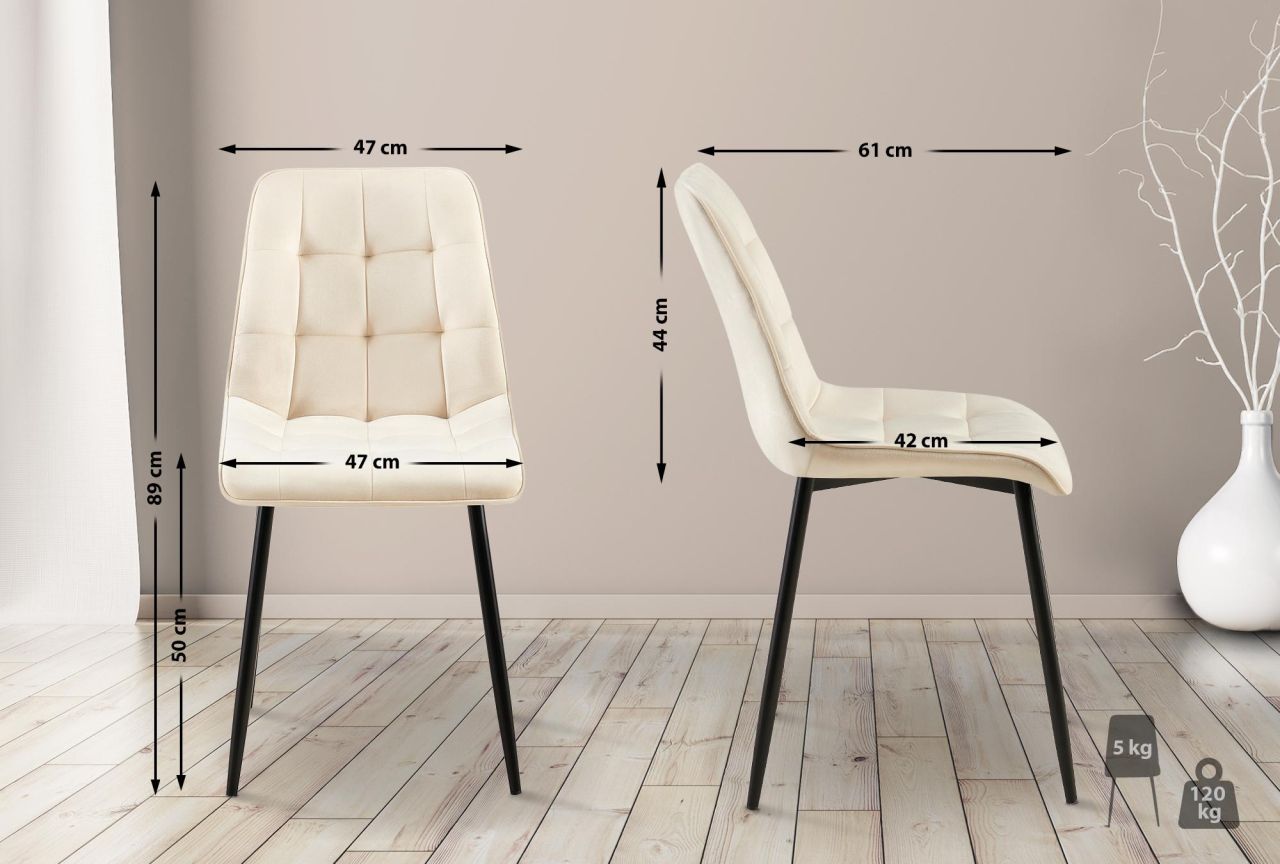 Esszimmerstuhl Gifford Samtbezug Der Esszimmerstuhl Gifford kombiniert hohen Sitzkomfort mit einer modernen und zeitgemäßen Optik. Für Ihren Esszimmertisch, die Küche, das Wohnzimmer, aber auch für andere Zwecke ist dieser Polsterstuhl somit eine tolle Wahl. Entscheidend für einen bequemen Sitz ist die angenehme Polsterung über Sitz und Rückenlehne. Dabei sind sowohl Sitzschale als auch Rückenlehne durchgängig mit einem pflegeleichten Samtbezug versehen. Die schicken Ziernähte erzeugen einen Blickfang. Fundament für diesen Esszimmerstuhl ist das standfeste, matt-schwarze Vierfußgestell aus stabilem Metall. So kann der Stuhl Gifford bedenkenlos mit bis zu 120 Kilogramm belastet werden. Bodenschoner beugen dabei Beschädigungen empfindlicher Böden vor. Details: Gesamthöhe: 89 cm Gesamtbreite: 47 cm Gesamttiefe: 61 cm Sitzhöhe: 50 cm Sitzfläche (B x T): 47 x 42 cm Höhe Rückenlehne: 44 cm …