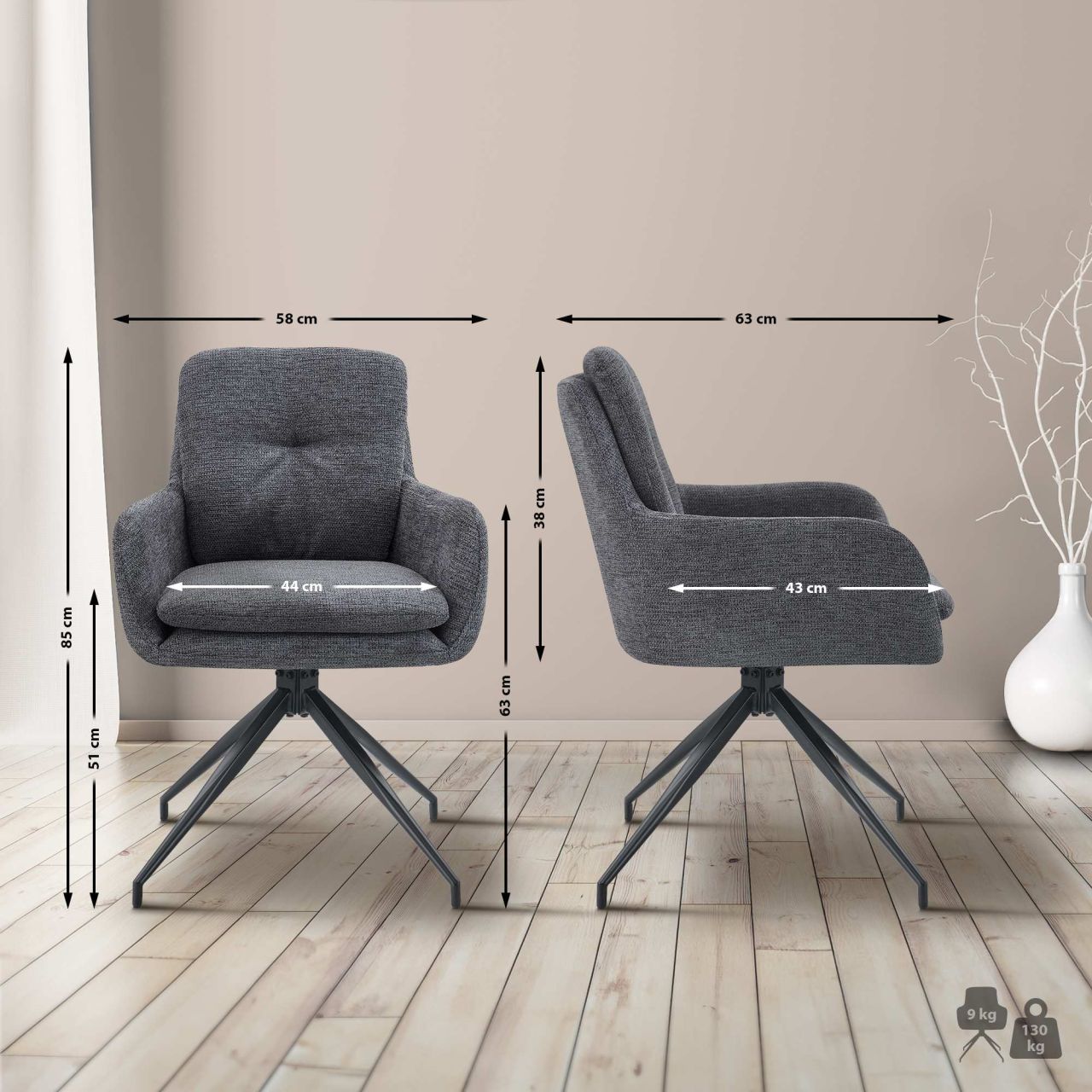 Esszimmerstuhl Pickett Stoffbezug Der Esszimmerstuhl Pickett kombiniert hohen Sitzkomfort mit einer modernen zeitgemäßen Optik. Für Ihren Esszimmertisch, die Küche, das Wohnzimmer, aber auch für andere Zwecke ist dieser Polsterstuhl somit eine tolle Wahl. Entscheidend für einen bequemen Sitz ist die angenehme Polsterung über Sitz, Rückenlehne und Armlehnen. Dabei ist die Sitzschale mit einem pflegeleichten und robusten Stoffbezug versehen. Die sogenannte Swivel-Funktion sorgt dafür, dass der Sitz in einer Spanne von 180 Grad schwenkbar ist, was zusätzliche Bewegungsfreiheit bringt. Fundament für diesen sesselartigen Stuhl ist das matt-schwarze Vierfußgestell aus pulverbeschichtetem Metall. So kann der Esszimmerstuhl Pickett bedenkenlos bis 130 Kilogramm belastet werden. Details: Gesamtbreite: 58 cm Gesamthöhe: 85 cm Gesamttiefe: 63 cm Sitzfläche (B x T): 44 x 43 cm Sitzhöhe: 51 cm Höh…