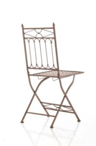 Klappstuhl Asina Dieser wunderschöne Stuhl in nostalgischem Design ist ein echter Hingucker auf jeder Terrasse und in jedem Garten. Er beeindruckt in seiner grazilen Form, wie auch in den liebevoll handgefertigten Details der Verzierungen. Er eignet sich perfekt um Ihrer Gartengestaltung eine besondere Note zu geben und ist wie geschaffen Ihren lauschigen Lieblingsplatz im Garten mit seinem Charme aus längst vergangenen Zeiten zu verschönern. Das Produkt wurde aus Eisen handgefertigt und daher extrem stabil. Die Oberfläche ist mit in Handarbeit nachempfundener antiker Patina veredelt. Dieses edle Designstück ist absolut neu und ergänzt sich hervorragend mit allen Metalltischen in unserem Shop. Ca. Abmessungen: Gesamthöhe: 95 cm Gesamtbreite: 40 cm Lehne: 41 x 40 cm Sitzfläche: 39 x 38 cm Sitzhöhe: 48 cm Maße zusammengeklappt: 103 x 10 cm