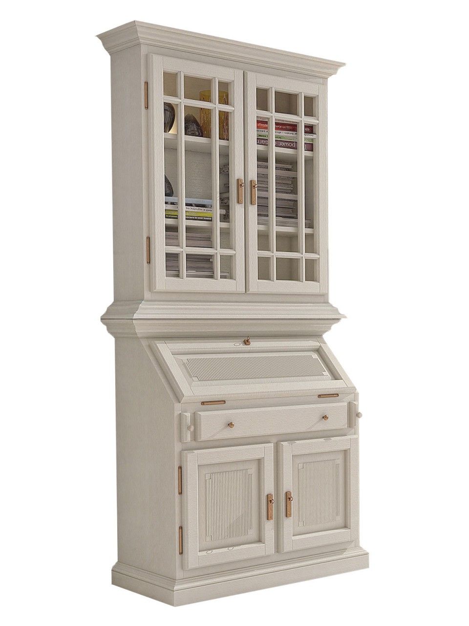 Maße: Breite ca. 103 cm, Höhe 212 cm, Tiefe 48 cm Ausstattung: oben: Aufsatzschrank mit 2 Glastüren mit Holzsprossen, dahinter 2 höhenverstellbare Holzeinlegeböden (B 85 cm, T 20 cm) unten: 1 Schreibtischklappe mit Riffelfront, mit Schlüssel abschließbar, dahinter 2 Holzschubladen (Innenmaß B 11, T 15, H 9 cm) und 2 offene Fächer die offene Schreibtischklappe ruht auf 2 ausziehbaren Holzführungen mittig: 1 Holzschublade (Innenmaß B 67, T 37, H 7 cm) unten: 2 Holztüren mit Riffelfront abschließbar, dahinter 1 Holzeinlegeboden (Innenmaß B 82, T 40 cm) Material: Pinie massiv Massivholz-Sekretär mit Aufsatz aus traditionell verarbeiteter Pinie im mediterranen Landhaus-Stil, Schlüssel und Beschläge messingfarben brüniert Schreibtisch Kombination aus hochwertiger Pinie in zwei Farben ( weitere Farben auf Anfrage mit 5% Aufpreis ) Heimbüro aus 100% Massivholz für natürliches Wohnen und natür…