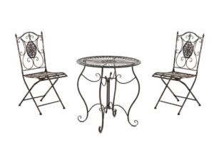Sitzgruppe Aldeano Diese wunderschöne Sitzgruppe in nostalgischem Design ist ein echter Hingucker auf jeder Terrasse und in jedem Garten. Sie beeindruckt in ihrer grazilen Form, wie auch in den liebevoll handgefertigten Details der Verzierungen. Sie eignet sich perfekt um Ihrer Gartengestaltung eine besondere Note zu geben und ist wie geschaffen Ihren lauschigen Lieblingsplatz im Garten mit ihrem Charme aus längst vergangenen Zeiten zu verschönern. Das Produkt wurde aus Eisen handgefertigt und ist daher extrem stabil. Die Oberfläche ist mit in Handarbeit nachempfundener antiker Patina veredelt. Dieses edle Designstück ist absolut neu und gleichzeitig eine perfekte Reproduktion in historischem Stil. Das Produkt ist original verpackt und leicht aufzubauen. Ca. Abmessungen: Stuhl Gesamthöhe: 91,5 cm Gesamtbreite: 42 cm Gesamttiefe: 49 cm Sitzhöhe: 42 cm Sitzfläche (BxT): 39 x 36 cm Breit…