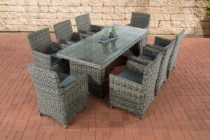 Sitzgruppe Fontana XL Hochwertig kombiniert: edel und ergonomisch. Dank der angeschrägten Rückenlehne verbunden mit angenehm erhöhten Armlehnen und einem bequemen Sitzpolster, das bereits im Lieferumfang enthalten ist, lässt es sich auf diesen Gartensesseln hervorragend sitzen. Ihr Gestell ist komplett mit Polyrattan umflochten, sodass neben der ansprechenden Optik auch eine besonders hohe Stabilität entsteht. Auch bei dem Tisch dieser Garnitur sind die Beine an den jeweiligen Tischenden in ähnlicher Weise eng miteinander verflochten. Sehr gelungen zeigt sich dazu die Verbindung des kompakten Geflechts mit der gläsernen Tischplatte. Sie wird an ihren abgerundeten Kanten von vier transparenten, rutschfesten Gumminoppen getragen. Materialzusammensetzung: 100% Polyester Ca. Maße: Stuhl: HxBxT: 91 x 59 x 60 cm Sitzhöhe: 44 cm zzgl. 5,5 cm Sitzkissen Sitzfläche (BxT): 47 x 47 cm Höhe Armle…