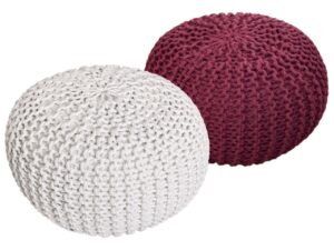 Sitzhocker Pouf SET 2 Stück Ø 55 cm H 37 cm Strickhocker Bodenkissen Grobstrick-Optik nachhaltig weiß & bordeux