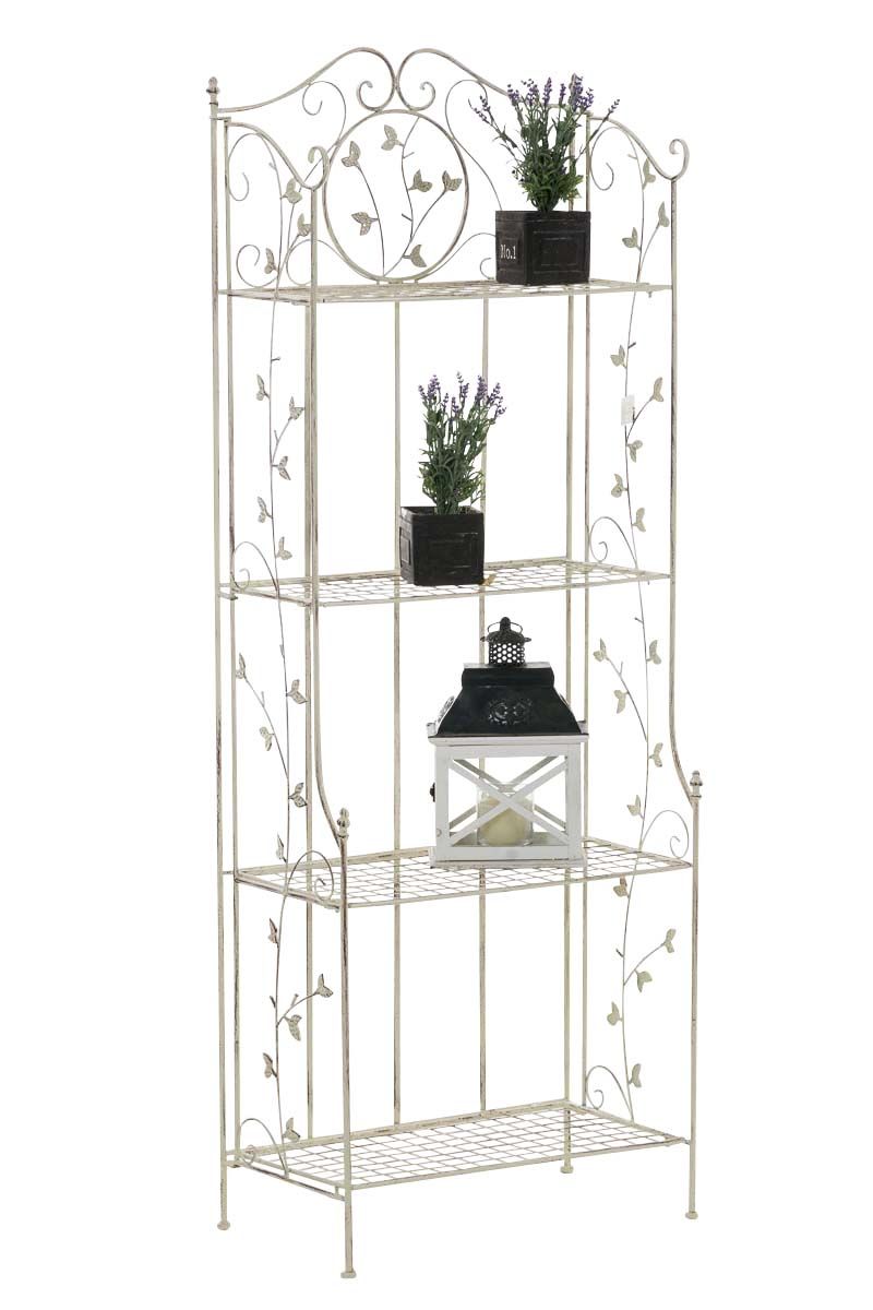 Standregal Arona – Der praktische Helfer im Landhausstil Das Modell “Arona” ist nicht aus dünnwandigem Blech, sondern aus extrem stabilem und dickem Eisenrohr. Die Qualität ist sehr gut. Es wird aus wenigen Teilen zusammengesetzt und ist sehr stabil. Eine Beschichtung (pulverbeschichtetes Eisen) macht dieses Regal sehr hochwertig und extrem langlebig. Die liebevollen Verzierungen im Landhausstil sehen sehr schön aus und verleihen einen antiken Charakter. Das Regal kann bei Bedarf zusammengeklappt werden! Das Produkt ist original verpackt und leicht aufzubauen. Es handelt sich um absolute Neuware. ACHTUNG: Lieferung erfolgt OHNE Dekoration! Ca. Abmessungen: Gesamthöhe: 158 cm Gesamtbreite: 60 cm Gesamttiefe: 33 cm Höhe Regalböden: 128, 90, 51, 12 cm Ablageflächen unten: 52 x 28 cm Ablageflächen oben: 52 x 22 cm