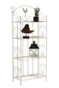 Klappbares Standregal Mia Das Modell “Mia” ist nicht aus dünnwandigem Blech, sondern aus extrem stabilem und dickem Eisenrohr. Die Qualität ist sehr gut. Eine Beschichtung (pulverbeschichtetes Eisen) macht dieses Regal sehr hochwertig und extrem langlebig. Die liebevollen Verzierungen im Landhausstil sehen sehr schön aus und verleihen einen antiken Charakter. Das Regal kann bei Bedarf zusammengeklappt werden! Das Produkt ist original verpackt und leicht aufzubauen. Es handelt sich um absolute Neuware. ACHTUNG: Lieferung erfolgt OHNE Dekoration! Ca. Abmessungen: Gesamthöhe: 153 cm Gesamtbreite: 61,5 cm Gesamttiefe: 33 cm Höhe Regalböden: 127, 96, 53, 10 cm Ablageflächen: 31,5 x 57 cm Abstand zwischen Ablageflächen: 43 cm (Abstand zw. den oberen: 29 cm) Standrohr Durchmesser: 15 mm Max. Belastbarkeit: 40 kg Belastbarkeit pro Ablagefläche: 10 kg