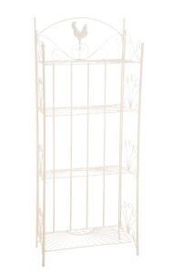 Klappbares Standregal Mia Das Modell “Mia” ist nicht aus dünnwandigem Blech, sondern aus extrem stabilem und dickem Eisenrohr. Die Qualität ist sehr gut. Eine Beschichtung (pulverbeschichtetes Eisen) macht dieses Regal sehr hochwertig und extrem langlebig. Die liebevollen Verzierungen im Landhausstil sehen sehr schön aus und verleihen einen antiken Charakter. Das Regal kann bei Bedarf zusammengeklappt werden! Das Produkt ist original verpackt und leicht aufzubauen. Es handelt sich um absolute Neuware. ACHTUNG: Lieferung erfolgt OHNE Dekoration! Ca. Abmessungen: Gesamthöhe: 153 cm Gesamtbreite: 61,5 cm Gesamttiefe: 33 cm Höhe Regalböden: 127, 96, 53, 10 cm Ablageflächen: 31,5 x 57 cm Abstand zwischen Ablageflächen: 43 cm (Abstand zw. den oberen: 29 cm) Standrohr Durchmesser: 15 mm Max. Belastbarkeit: 40 kg Belastbarkeit pro Ablagefläche: 10 kg
