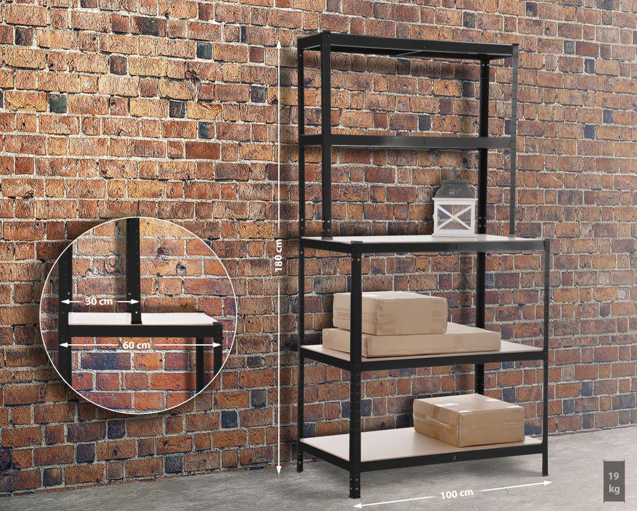 Steckregal mit Werkbank Zur Lagerung schwerer Gegenstände ist dieses Steckregal bestens geeignet. In Kombination mit dem verzinkten Metallgestell kann jedes einzelne der fünf Regal-Ebenen bis zu 175 Kilogramm tragen. Dabei kann die mittlere Regalfläche ideal auch als Arbeitsfläche benutzt werden. Mit einer Höhe von 180 cm und einer Breite von 100 cm ergibt sich sehr viel Stauraum, ob im Keller, in der Garage, im Werk- oder Lagerraum. Das Regal verfügt über Bodenschoner, sodass empfindliche Böden nicht beschädigt werden. Die Montage des Regals erfordert praktischerweise kein Werkzeug. Alle Komponenten können schnell und einfach zusammengesteckt werden. Für ideale Standfestigkeit sollte das Lagerregal an einer Wand fixiert werden. Details: Gesamthöhe: 180 cm Gesamtbreite: 100 cm Gesamttiefe (unten): 60 cm Gesamttiefe (oben): 30 cm Blechstärke: 1 mm Dicke der Regalbretter: 6,2 mm Tragfäh…