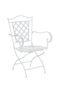 Stuhl Adara Dieser wunderschöne Stuhl in nostalgischem Design ist ein echter Hingucker auf jeder Terrasse und in jedem Garten. Er beeindruckt in seiner grazilen Form, wie auch in den liebevoll handgefertigten Details der Verzierungen. Er eignet sich perfekt um Ihrer Gartengestaltung eine besondere Note zu geben und ist wie geschaffen Ihren lauschigen Lieblingsplatz im Garten mit seinem Charme aus längst vergangenen Zeiten zu verschönern. Das Produkt wurde aus Eisen handgefertigt und daher extrem stabil. Die Oberfläche ist mit in Handarbeit nachempfundener antiker Patina veredelt. Dieses edle Designstück ist absolut neu und ergänzt sich hervorragend mit allen Metalltischen in unserem Shop. Ca. Abmessungen: Gesamthöhe: 93 cm Gesamtbreite: 56 cm Gesamttiefe: 51 cm Sitzhöhe: 43 cm Sitztiefe: 44 cm Höhe Rückenlehne: 53,5 cm Breite Armlehnen: 3,5 cm Rohrdurchmesser: 1,5 cm Max. Belastbarkei…