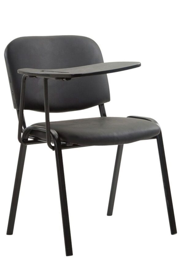 Stuhl Ken mit Klapptisch Dieser Besucherstuhl ist ideal für Wartezimmer, Messen und andere Veranstaltungen geeignet. Der praktische Klapptisch gibt ohne großen Aufwand die Möglichkeit bequem zu Sitzen und trotzdem eine Arbeitsfläche zu bieten ohne sich zusätzlich an einen Tisch setzen zu müssen. Neben Optik und zeitlosem Design zeichnet sich dieser Besucherstuhl besonders durch seine gepolsterte Sitzfläche aus, die auch längere Sitzphasen nicht anstrengend werden lässt. Durch den Tisch ist der Stuhl nicht stapelbar. Materialzusammensetzung: 100% Polyurethan Ca. Maße: Gesamthöhe: 81 cm Gesamtbreite: 53 cm Gesamttiefe: 71 cm Sitzhöhe: 46 cm Sitzfläche (BxT): 48 x 40 cm Tischhöhe: 69 cm Höhe der Rückenlehne: 38 cm Gewicht: 6 kg Sitz: Material: Kunstleder Sitz und Rückenlehne bequem gepolstert Gestell: Material: Metall 4-Fuß Gestell Farbe: Schwarz Besonderheiten: Mit Klapptisch Stabile Ko…