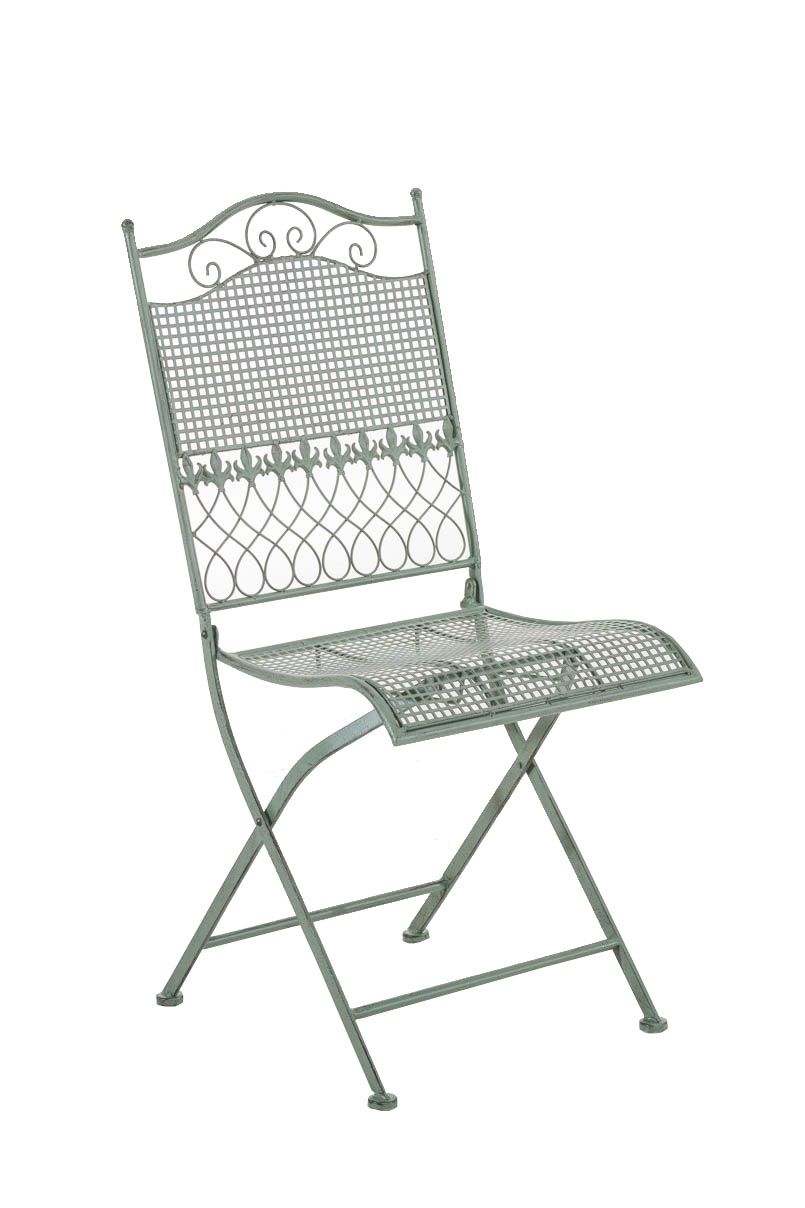 Klappstuhl Kiran Dieser wunderschöne Stuhl in nostalgischem Design ist ein echter Hingucker auf jeder Terrasse und in jedem Garten. Er beeindruckt in seiner grazilen Form, wie auch in den liebevoll handgefertigten Details der Verzierungen. Er eignet sich perfekt um Ihrer Gartengestaltung eine besondere Note zu geben und ist wie geschaffen Ihren lauschigen Lieblingsplatz im Garten mit seinem Charme aus längst vergangenen Zeiten zu verschönern.Das Produkt wurde aus Eisen handgefertigt und daher extrem stabil. Die Oberfläche ist mit in Handarbeit nachempfundener antiker Patina veredelt. Dieses edle Designstück ist absolut neu und ergänzt sich hervorragend mit allen Metalltischen in unserem Shop. Ca. Abmessungen: Gesamthöhe: 91 cm Gesamtbreite: 41 cm Gesamttiefe: 50 cm Sitzhöhe: 45 cm Sitzfläche: 37 x 32 cm Höhe Rückenlehne: 50 cm