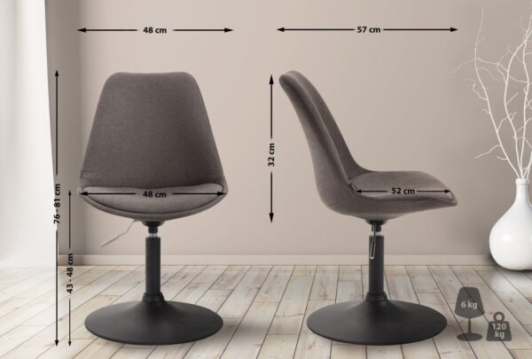 Esszimmerstuhl Maverick Stoff-Bezug Der Loungestuhl Maverick verkörpert Eleganz und Komfort. Sein Stoff-Bezug bietet ein angenehmes Sitzgefühl und ist dabei langlebig. Der Polsterstuhl ist um 360 Grad drehbar und stufenlos höhenverstellbar, sodass sich die Sitzhöhe zwischen 43 und 48 cm einstellen lässt. Dadurch ist der Stuhl für verschiedene Tischhöhen und Körpergrößen einsetzbar. Mit einer Rückenlehne bietet er komfortable Unterstützung insbesondere für den unteren Rückenbereich. Das robuste Metallgestell gewährleistet Stabilität und eine Belastbarkeit von bis zu 120 Kilogramm. Bodenschoner schützen Böden vor Kratzern. Der Stuhl ist die perfekte Ergänzung zu modern eingerichteten Räumen, ob für Wohnzimmer, Esszimmer und Küche oder öffentliche Bereiche, wie Hotels, Lounges und Wartebereiche. Materialzusammensetzung: 100 % Polyester Details: Gesamthöhe: 76 – 81 cm Gesamtbreite: 48 cm …