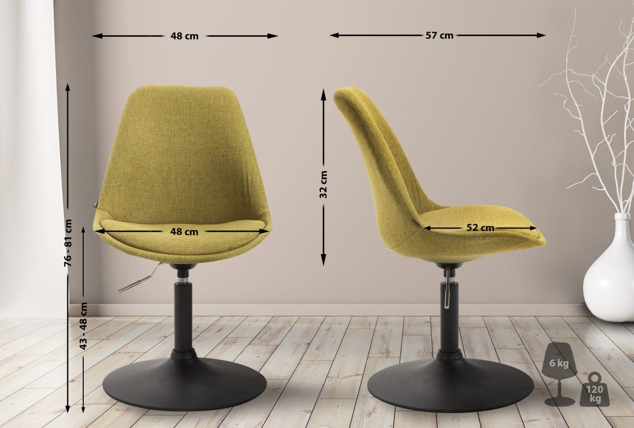 Esszimmerstuhl Maverick Stoff-Bezug Der Loungestuhl Maverick verkörpert Eleganz und Komfort. Sein Stoff-Bezug bietet ein angenehmes Sitzgefühl und ist dabei langlebig. Der Polsterstuhl ist um 360 Grad drehbar und stufenlos höhenverstellbar, sodass sich die Sitzhöhe zwischen 43 und 48 cm einstellen lässt. Dadurch ist der Stuhl für verschiedene Tischhöhen und Körpergrößen einsetzbar. Mit einer Rückenlehne bietet er komfortable Unterstützung insbesondere für den unteren Rückenbereich. Das robuste Metallgestell gewährleistet Stabilität und eine Belastbarkeit von bis zu 120 Kilogramm. Bodenschoner schützen Böden vor Kratzern. Der Stuhl ist die perfekte Ergänzung zu modern eingerichteten Räumen, ob für Wohnzimmer, Esszimmer und Küche oder öffentliche Bereiche, wie Hotels, Lounges und Wartebereiche. Materialzusammensetzung: 100 % Polyester Details: Gesamthöhe: 76 – 81 cm Gesamtbreite: 48 cm …
