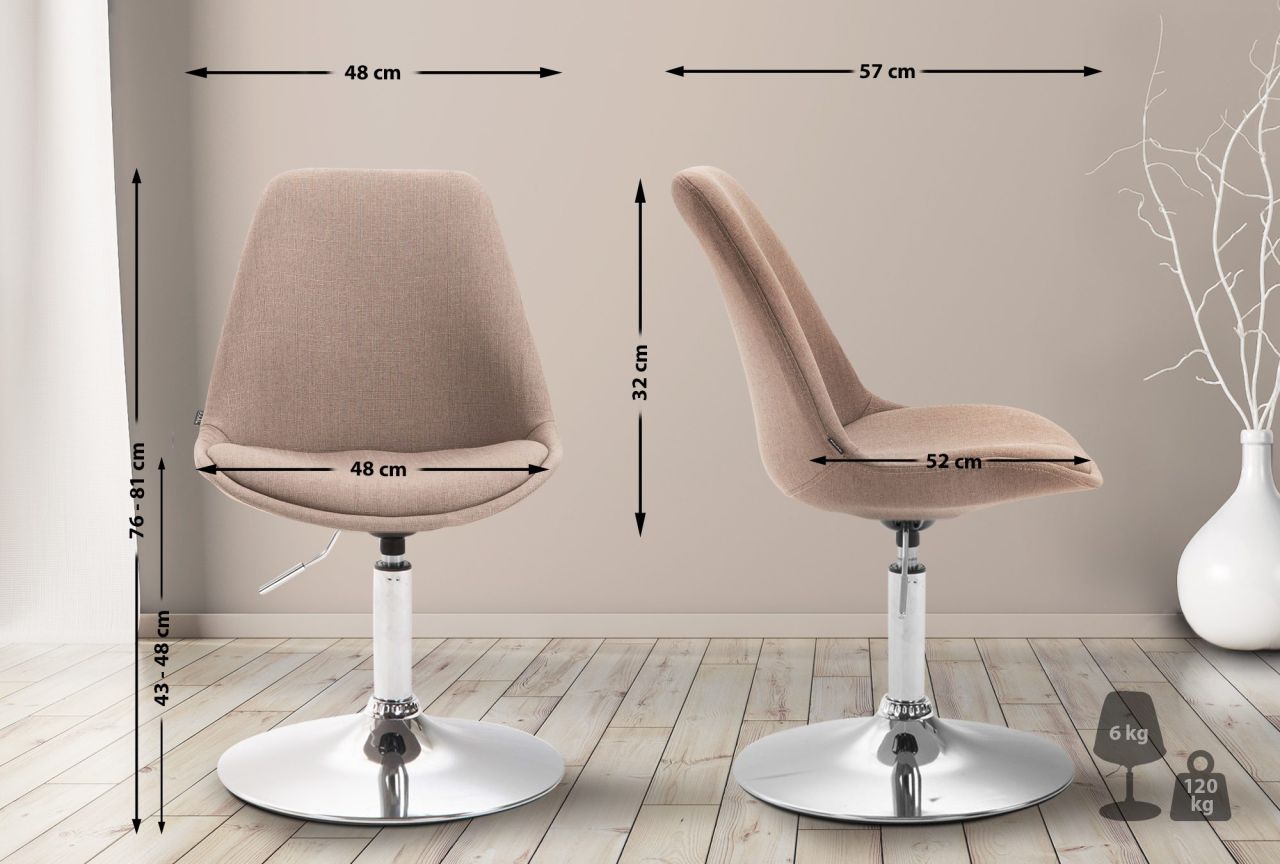 Esszimmerstuhl Maverick Stoff-Bezug Der Loungestuhl Maverick verkörpert Eleganz und Komfort. Sein Stoff-Bezug bietet ein angenehmes Sitzgefühl und ist dabei langlebig. Der Polsterstuhl ist um 360 Grad drehbar und stufenlos höhenverstellbar, sodass sich die Sitzhöhe zwischen 43 und 48 cm einstellen lässt. Dadurch ist der Stuhl für verschiedene Tischhöhen und Körpergrößen einsetzbar. Mit einer Rückenlehne bietet er komfortable Unterstützung insbesondere für den unteren Rückenbereich. Das robuste Metallgestell gewährleistet Stabilität und eine Belastbarkeit von bis zu 120 Kilogramm. Bodenschoner schützen Böden vor Kratzern. Der Stuhl ist die perfekte Ergänzung zu modern eingerichteten Räumen, ob für Wohnzimmer, Esszimmer und Küche oder öffentliche Bereiche, wie Hotels, Lounges und Wartebereiche. Materialzusammensetzung: 100 % Polyester Details: Gesamthöhe: 76 – 81 cm Gesamtbreite: 48 cm …