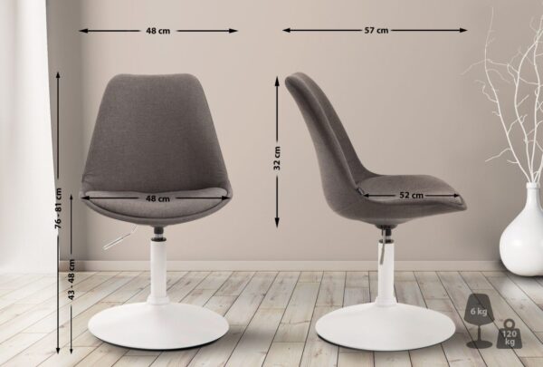 Esszimmerstuhl Maverick Stoff-Bezug Der Loungestuhl Maverick verkörpert Eleganz und Komfort. Sein Stoff-Bezug bietet ein angenehmes Sitzgefühl und ist dabei langlebig. Der Polsterstuhl ist um 360 Grad drehbar und stufenlos höhenverstellbar, sodass sich die Sitzhöhe zwischen 43 und 48 cm einstellen lässt. Dadurch ist der Stuhl für verschiedene Tischhöhen und Körpergrößen einsetzbar. Mit einer Rückenlehne bietet er komfortable Unterstützung insbesondere für den unteren Rückenbereich. Das robuste Metallgestell gewährleistet Stabilität und eine Belastbarkeit von bis zu 120 Kilogramm. Bodenschoner schützen Böden vor Kratzern. Der Stuhl ist die perfekte Ergänzung zu modern eingerichteten Räumen, ob für Wohnzimmer, Esszimmer und Küche oder öffentliche Bereiche, wie Hotels, Lounges und Wartebereiche. Materialzusammensetzung: 100 % Polyester Details: Gesamthöhe: 76 – 81 cm Gesamtbreite: 48 cm …