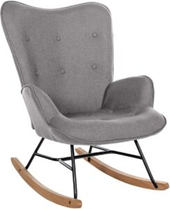 Schaukelstuhl Sanka – Bringt Schwung in Ihr Leben! Der Schaukelstuhl Sanka ist eine bequeme, solide und zugleich stilvolle Sitzgelegenheit für den täglichen Gebrauch. Das moderne Möbelstück fügt sich ideal in fast jedes Wohnzimmerambiente ein. Einen angenehmen Sitzkomfort verspricht die bequem gepolsterte Sitzschale mit Stoffbezug. Die Knöpfe auf dem Rückenpolster setzen dabei modische Akzente. Die elegant geformten Kufen aus Buchenholz sind mit einem hochwertigen schwarz lackierten Metallgestell verschraubt, was dem Stuhl seine hohe Stabilität verleiht. Ein rundum wunderschönes Möbelstück an dem Sie lange Freude haben werden! Materialzusammensetzung: 100% Polyester Ca. Maße: Gesamthöhe: 98 cm Gesamtbreite: 71 cm Gesamttiefe: 88 cm Sitzhöhe: 48 cm Sitzfläche (BxT): 62 x 55 cm Höhe Rückenlehne: 64 cm Höhe Armlehne (vom Boden): 58 cm Max. Belastbarkeit: 136 kg Gewicht: 16 kg Sitz: Bezug…