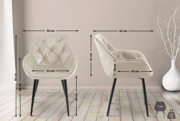 Esszimmerstuhl Tanna Samt Der Esszimmerstuhl Tanna ist die ideale Ergänzung für zeitgemäße Wohnräume und zieht in jedem Zimmer die Blicke auf sich. Mit seiner sesselförmigen Gestaltung besticht der Sitz nicht nur durch sein modernes Erscheinungsbild, sondern auch durch hohen Komfort. Dieser wird durch umlaufend erhöhte Armlehnen und eine gepolsterte Rückenlehne gewährleistet. Durch die Verwendung pflegeleichter Materialien lässt sich der Polsterstuhl problemlos und schnell reinigen. Auf seinem modernen 4-Fuß Metallgestell präsentiert sich der Stuhl zu jeder Gelegenheit in bestem Licht. Zudem sind Bodenschoner unter den Füßen angebracht, um Kratzer auf dem Boden zu verhindern. Es stehen verschiedene Farben zur Auswahl. Materialzusammensetzung: 100 % Polyester Ca. Maße: Gesamthöhe: 83 cm Gesamtbreite: 58 cm Gesamttiefe: 62 cm Sitzhöhe: 46 cm Sitzfläche (B x T): 54 x 45 cm Höhe Rückenleh…