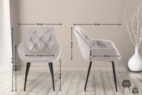 Esszimmerstuhl Tanna Samt Der Esszimmerstuhl Tanna ist die ideale Ergänzung für zeitgemäße Wohnräume und zieht in jedem Zimmer die Blicke auf sich. Mit seiner sesselförmigen Gestaltung besticht der Sitz nicht nur durch sein modernes Erscheinungsbild, sondern auch durch hohen Komfort. Dieser wird durch umlaufend erhöhte Armlehnen und eine gepolsterte Rückenlehne gewährleistet. Durch die Verwendung pflegeleichter Materialien lässt sich der Polsterstuhl problemlos und schnell reinigen. Auf seinem modernen 4-Fuß Metallgestell präsentiert sich der Stuhl zu jeder Gelegenheit in bestem Licht. Zudem sind Bodenschoner unter den Füßen angebracht, um Kratzer auf dem Boden zu verhindern. Es stehen verschiedene Farben zur Auswahl. Materialzusammensetzung: 100 % Polyester Ca. Maße: Gesamthöhe: 83 cm Gesamtbreite: 58 cm Gesamttiefe: 62 cm Sitzhöhe: 46 cm Sitzfläche (B x T): 54 x 45 cm Höhe Rückenleh…