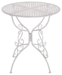 Tisch Amanda Dieser wunderschöne Tisch in nostalgischem Design ist ein echter Hingucker auf jeder Terrasse und in jedem Garten. Er beeindruckt in seiner grazilen Form, wie auch in den liebevoll handgefertigten Details der Verzierungen. Er eignet sich perfekt um Ihrer Gartengestaltung eine besondere Note zu geben und ist wie geschaffen Ihren lauschigen Lieblingsplatz im Garten mit seinem Charme aus längst vergangenen Zeiten zu verschönern.Das Produkt wurde aus Eisen handgefertigt und ist daher extrem stabil. Die Oberfläche ist mit in Handarbeit nachempfundener antiker Patina veredelt. Dieses edle Designstück ist absolut neu und gleichzeitig eine perfekte Reproduktion in historischem Stil. Ca. Maße: Gesamthöhe: 74 cm Gesamtbreite: 70 cm Gesamttiefe: 70 cm Rohrdurchmesser: 2 cm
