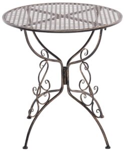 Tisch Amanda Dieser wunderschöne Tisch in nostalgischem Design ist ein echter Hingucker auf jeder Terrasse und in jedem Garten. Er beeindruckt in seiner grazilen Form, wie auch in den liebevoll handgefertigten Details der Verzierungen. Er eignet sich perfekt um Ihrer Gartengestaltung eine besondere Note zu geben und ist wie geschaffen Ihren lauschigen Lieblingsplatz im Garten mit seinem Charme aus längst vergangenen Zeiten zu verschönern.Das Produkt wurde aus Eisen handgefertigt und ist daher extrem stabil. Die Oberfläche ist mit in Handarbeit nachempfundener antiker Patina veredelt. Dieses edle Designstück ist absolut neu und gleichzeitig eine perfekte Reproduktion in historischem Stil. Ca. Maße: Gesamthöhe: 74 cm Gesamtbreite: 70 cm Gesamttiefe: 70 cm Rohrdurchmesser: 2 cm