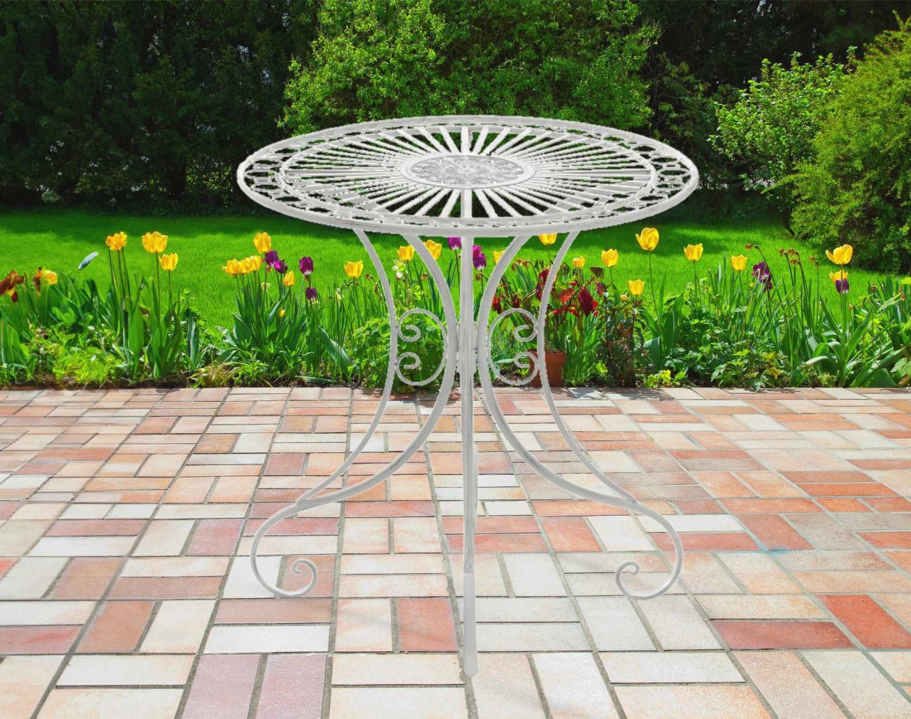 Gartentisch Hari Der Tisch Hari punktet mit seinem nostalgischem Design. Die grazile Form, die liebevollen Verzierungen und die nachempfundene Patina des Gartentisches unterstreichen die exklusive Optik. Mit der kompakten Größe eignet sich der Esstisch auch für kleinere Gärten, Terrassen und Balkone. Das Produkt wurde aus Eisen handgefertigt und daher stabil. Details: Gesamthöhe: 73 cm Durchmesser der Tischplatte: 70 cm Gewicht: 4 kg Max. Belastbarkeit 20 kg