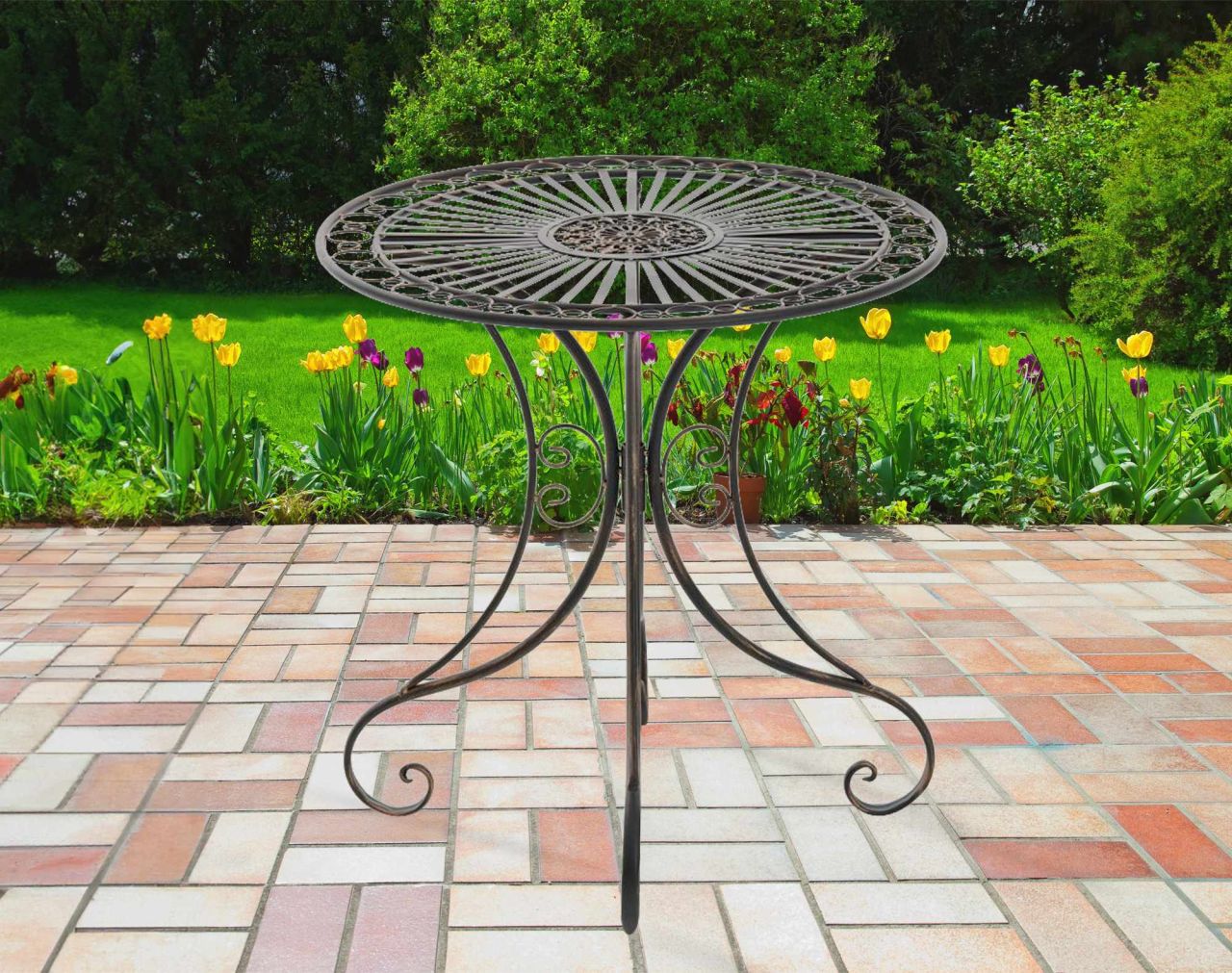 Gartentisch Hari Der Tisch Hari punktet mit seinem nostalgischem Design. Die grazile Form, die liebevollen Verzierungen und die nachempfundene Patina des Gartentisches unterstreichen die exklusive Optik. Mit der kompakten Größe eignet sich der Esstisch auch für kleinere Gärten, Terrassen und Balkone. Das Produkt wurde aus Eisen handgefertigt und daher stabil. Details: Gesamthöhe: 73 cm Durchmesser der Tischplatte: 70 cm Gewicht: 4 kg Max. Belastbarkeit 20 kg