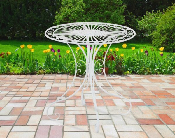 Gartentisch Hari Der Tisch Hari punktet mit seinem nostalgischem Design. Die grazile Form, die liebevollen Verzierungen und die nachempfundene Patina des Gartentisches unterstreichen die exklusive Optik. Mit der kompakten Größe eignet sich der Esstisch auch für kleinere Gärten, Terrassen und Balkone. Das Produkt wurde aus Eisen handgefertigt und daher stabil. Details: Gesamthöhe: 73 cm Durchmesser der Tischplatte: 70 cm Gewicht: 4 kg Max. Belastbarkeit 20 kg