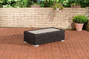 Lounge Tisch Madeira Das Design dieser kompakten Terrassen-Möbel überzeugt mit allen Ecken und Kanten: Die modern kastige Optik mit dem ringsum bodentief geflochtenen Polyrattan-Material strahlt Stabilität und dauerhaften Komfort aus. Der Sofatisch ist in dichter Flechtweise gearbeitet. Seine Glas-Tischplatte ist an den Seiten hochwertig geschliffen und liegt rutschfest auf, da sie durch transparente Gumminoppen in den Ecken fixiert wird. Ca. Maße: Höhe: 33 cm Breite: 110 cm Tiefe: 60 cm Glasplatte: 94,5 x 44,5 cm 5 mm Sicherheitsglas Materialien und Verarbeitung Diese exklusive Garnitur erfüllt nicht nur optisch höchste Ansprüche – auch die in Handarbeit verwendeten Materialien entsprechen besten Qualitätsstandards und gewährleisten Stabilität und Langlebigkeit. Das besonders gut für die Verwendung im Außenbereich geeignete UV-beständige Material Polyrattan sieht aus wie herkömmliche…