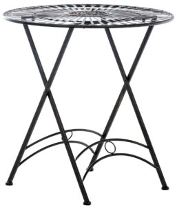 Tisch Tegal Dieser Gartentisch ist ganz aus Metall im antiken Stil gefertigt. Das nostalgische Design besticht durch seine filigrane Ausführung und wird dadurch zum echten Hingucker auf jeder Terrasse und jedem Garten. Er beeindruckt in seiner grazilen Form, wie auch in den liebevoll handgefertigten Details der Verzierungen. Er eignet sich perfekt um Ihrer Gartengestaltung eine besondere Note zu geben. Der Bistrotisch wurde aus Eisen handgefertigt und ist daher extrem stabil. Die Oberfläche ist mit in Handarbeit nachempfundener antiker Patina veredelt. Der Tisch ist natürlich auch ein perfekter Balkontisch. Zusammen mit den passenden Klappstühlen ergibt sich eine tolle Sitzgruppe, die auch jeder Terrasse ein nostalgisches und vor allem romantisches Ambiente verleiht. Mit wenigen Handgriffen lässt sich der Tisch leicht auf- und abbauen und kann somit einfach verstaut werden. Ca. Maße: …