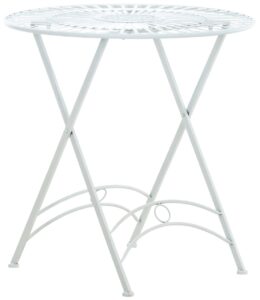Tisch Tegal Dieser Gartentisch ist ganz aus Metall im antiken Stil gefertigt. Das nostalgische Design besticht durch seine filigrane Ausführung und wird dadurch zum echten Hingucker auf jeder Terrasse und jedem Garten. Er beeindruckt in seiner grazilen Form, wie auch in den liebevoll handgefertigten Details der Verzierungen. Er eignet sich perfekt um Ihrer Gartengestaltung eine besondere Note zu geben. Der Bistrotisch wurde aus Eisen handgefertigt und ist daher extrem stabil. Die Oberfläche ist mit in Handarbeit nachempfundener antiker Patina veredelt. Der Tisch ist natürlich auch ein perfekter Balkontisch. Zusammen mit den passenden Klappstühlen ergibt sich eine tolle Sitzgruppe, die auch jeder Terrasse ein nostalgisches und vor allem romantisches Ambiente verleiht. Mit wenigen Handgriffen lässt sich der Tisch leicht auf- und abbauen und kann somit einfach verstaut werden. Ca. Maße: …