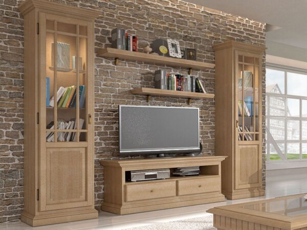 Wohnwand Wohnzimmer Schrank Set Duett 2 Vitrinen TV Schrank 2 Bücher-Regale Duett Pinie massiv Pinie karamell mit LED-Beleuchtung